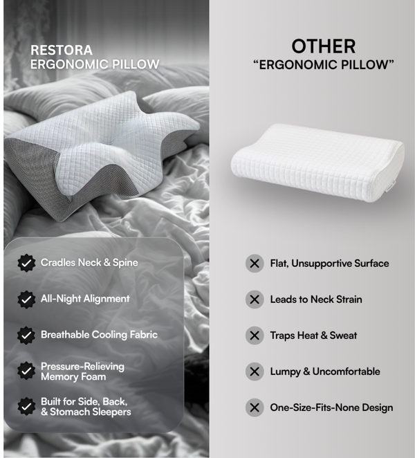 Tired of morning neck pain that ruins workouts and workdays? Restora Pillow contours to your head and supports your neck so you wake refreshed. Experience fewer aches, faster morning routines, and better focus at work with pillow ergonomics that keep your spine aligned all night.